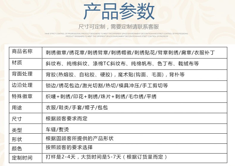产品工艺:平面绣花、背胶、背魔术贴等